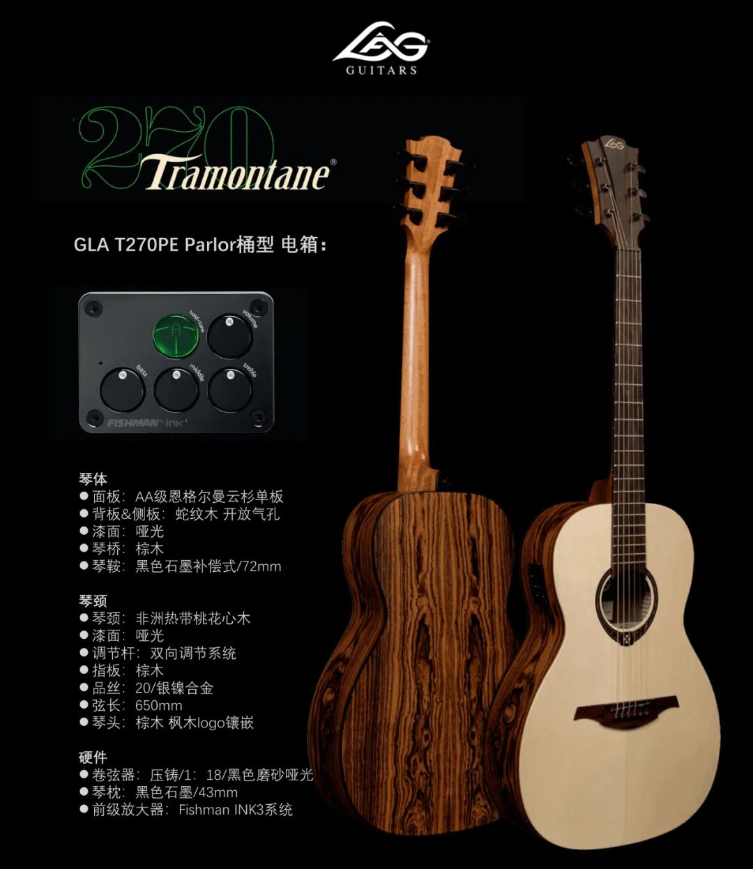 LÂG Tramontane T270系列—蛇纹木与法式浪漫的完美组合!为了多方面呈现T270PE的效果,楠哥将通过话筒收音和压电拾音器内录的两种收音方式,让我们一起来感受感受! 楠哥弹奏的是T270的Paro桶型,除此之外还有两种尺寸— Dreadnought桶型、 Auditorium桶型,该系列结合了精心挑选的木材,它的音质和制作工艺堪称典范,极具性价比。面板使用的是坚固的AA级恩格尔曼云杉单板,搭配Fishman INK3前置放大器来实现反馈精确的拾音。