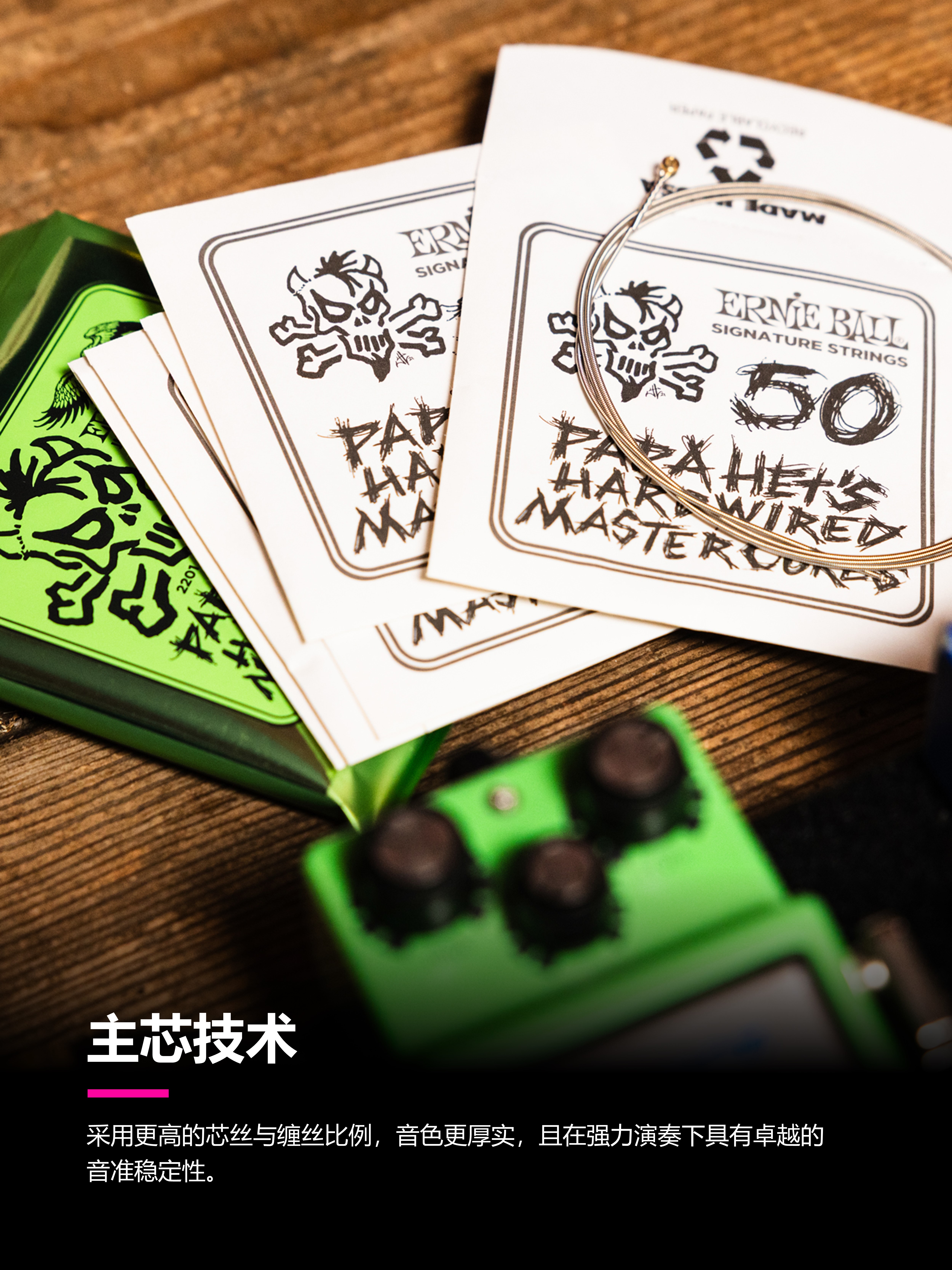为了支撑这种演奏强度,James 与 Ernie Ball 联手打造了一套真正属于重型节奏吉他手的武器—— Papa Het’s Hardwired Master Cores Signature Strings