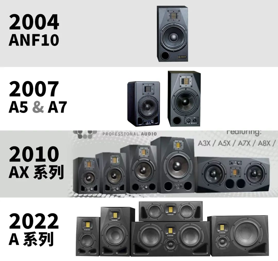 2004 年发布首款近场监听 ANF10 之后,每隔三年,ADAM 就会给“A 系列”换代,到了 2010 年的 AX 系列,已经扩充到 5 大型号,成为中端监听和小型录音棚的标准之一。 但也是在 2010 年之后,ADAM 陷入了长时间动荡,直到 2019 年才重回正轨,稳定下来的第一件事,就是更新年迈的 A 系列。