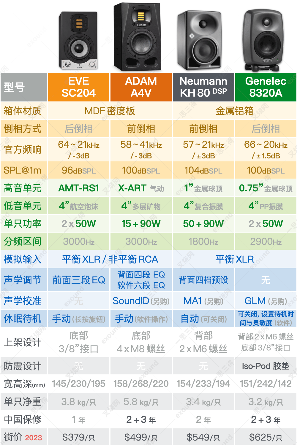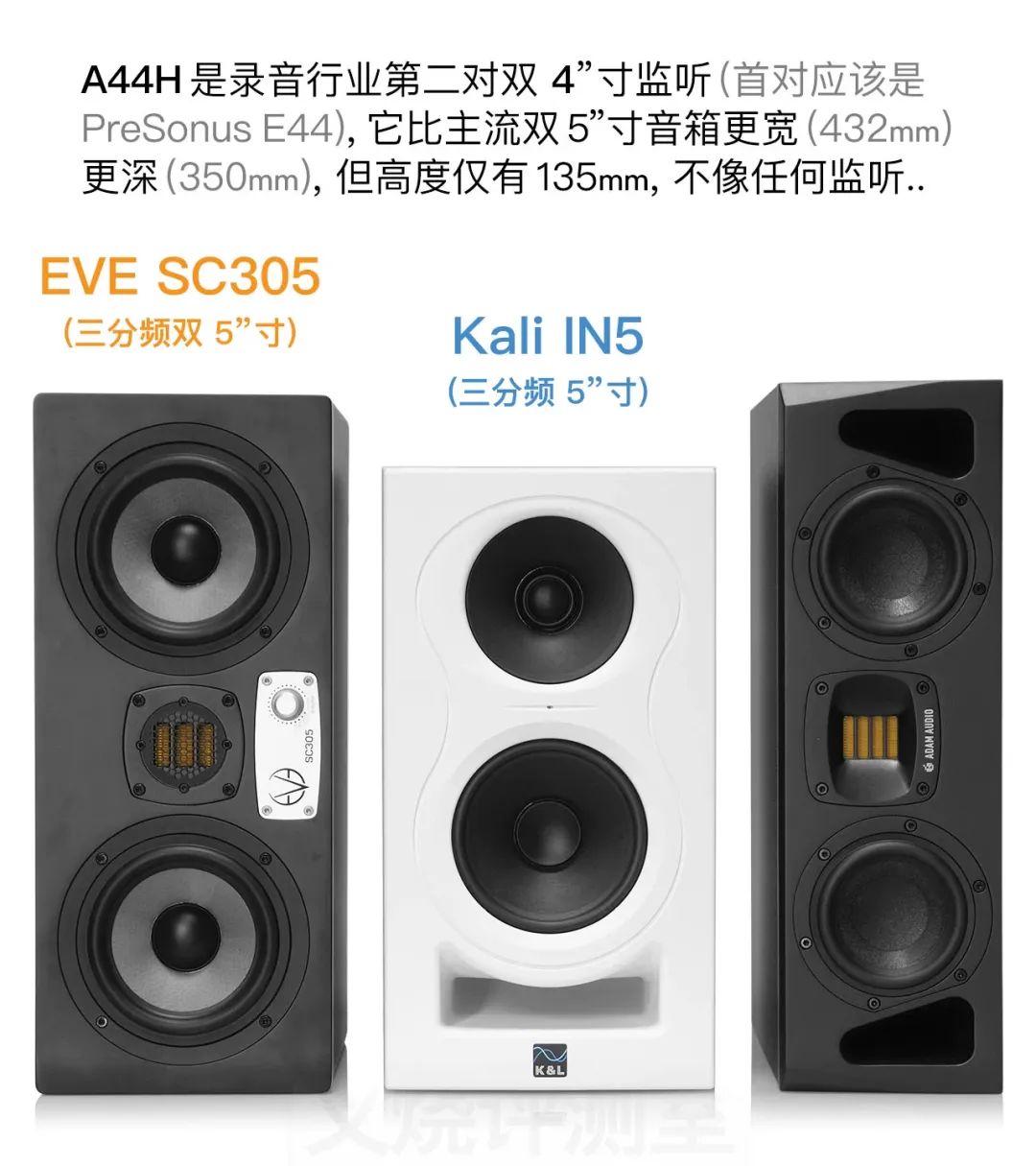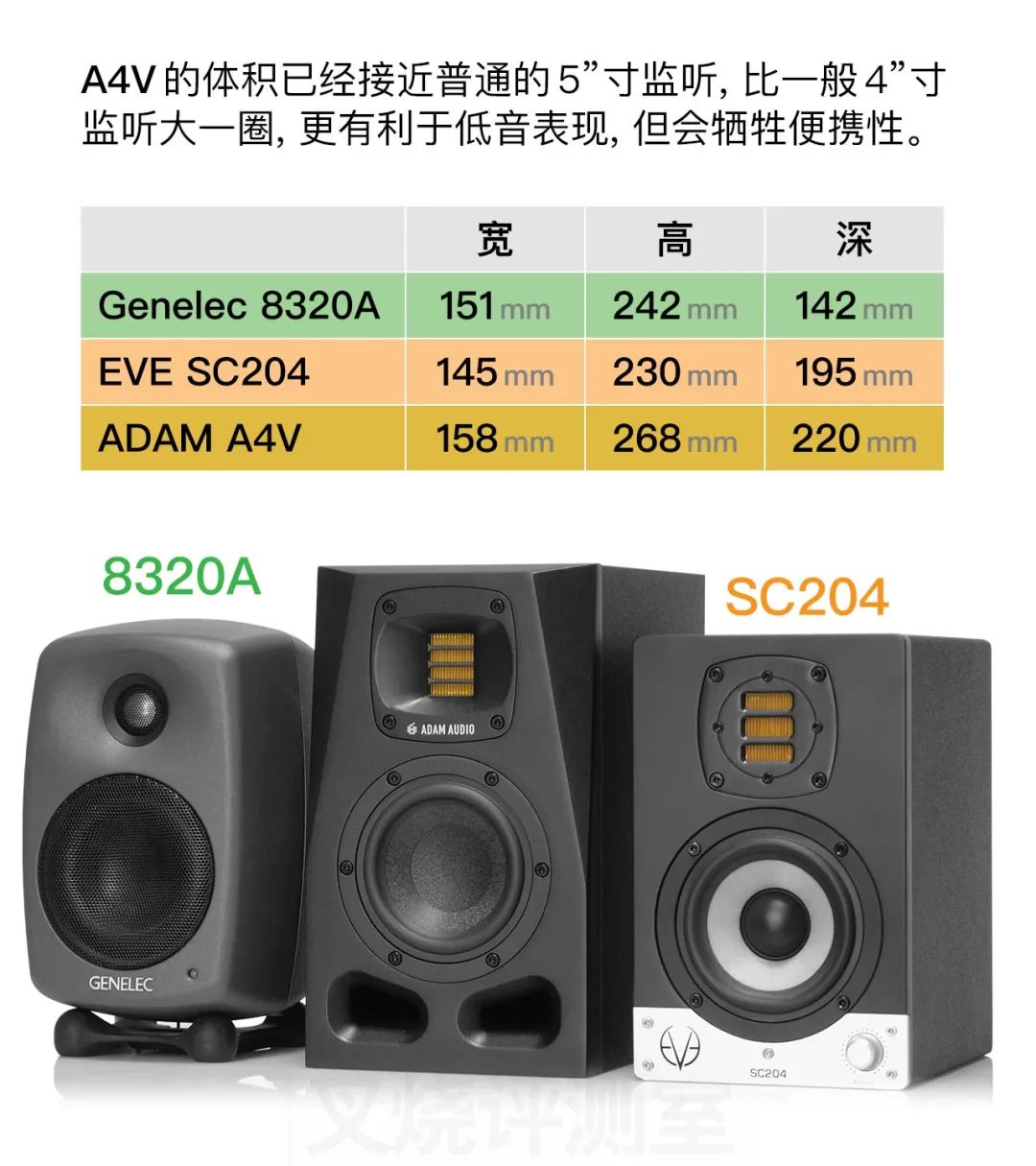 对比“同门”的 EVE SC204、以及更贵的 4”监听真力 8320 (很遗憾没有 KH80,但内行应该知道 KH80 和 8320A 也算“同门”),