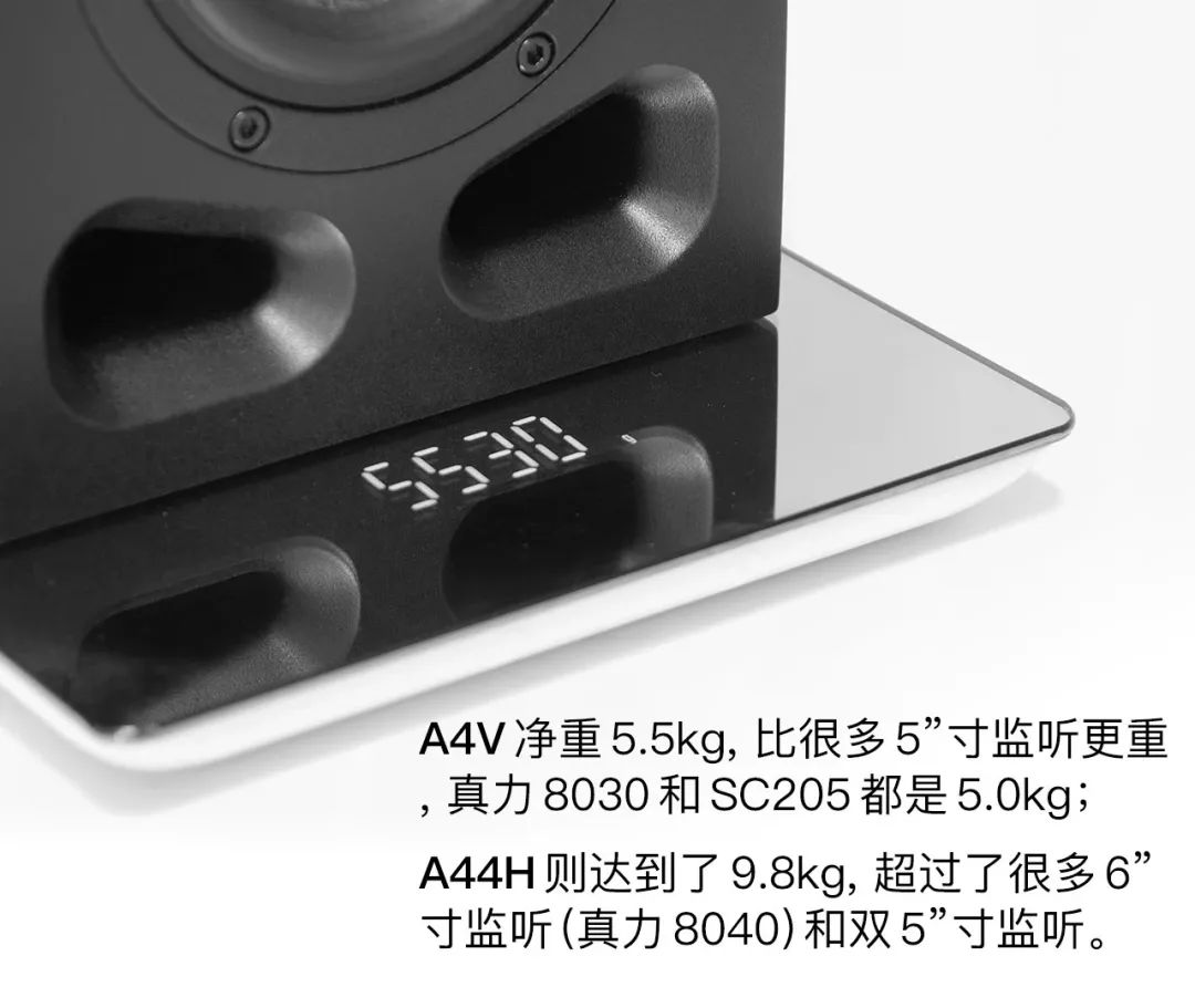 A4V 和 A7V 是共享 90W 功放模块的,加上超大箱体的加持,因此 A4V 的下潜也比 SC205 和真力 8320 起码深 10Hz.. 达到 5”寸监听的水准。其实上一代 A3X (4.0”寸) 官方数据只有 60Hz/-10dB,A4V 相当于“加一寸”。