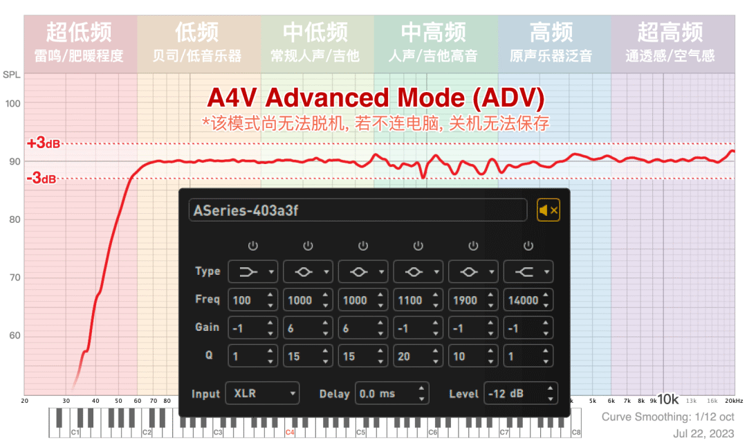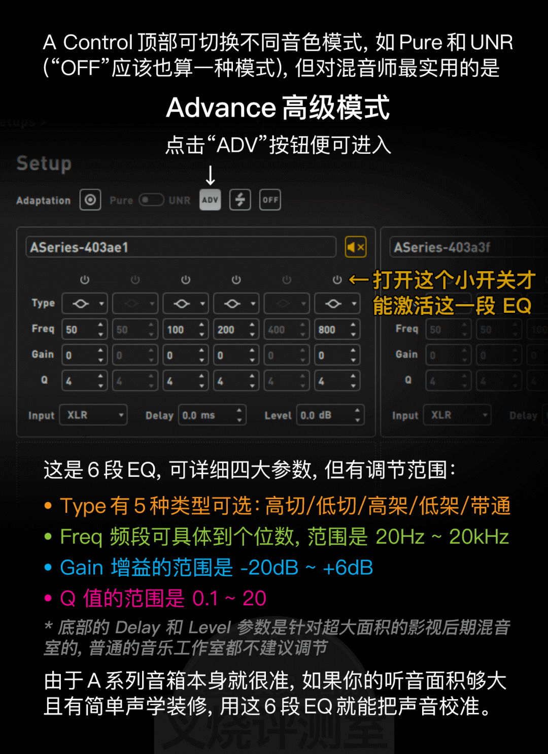用网线连接电脑,在 A Control 中打开“ADV/高级模式”小按钮,开启 6 段 EQ 功能,由于这个 EQ 能精确到个位数调节频率、精确到 0.1dB 调节增益、还可以调节 Q 值 (范围),