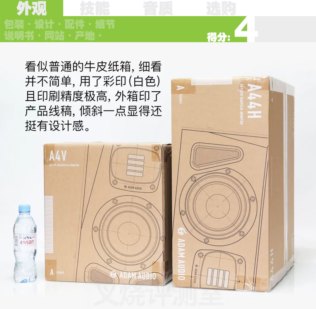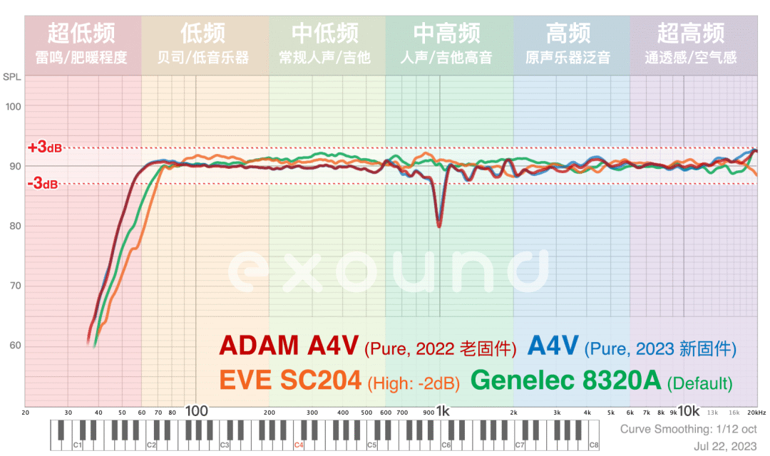 一般的音乐人可能都听不出来这个“管口共振”,但职业混音师可能会察觉:高音乐器的“硬度”有所削减 (老白盆是通过提升 1kHz 来增加硬度),让高音乐器听起来略微偏软。 对比同门的 SC204,试听乐器少、低音少的歌曲,两者很难一耳朵听出区别,但乐器多起来之后区别开始明显,可能要用 SC205 才能对比 A4V (两者体积也接近).. 另外 EVE 的高音功率更大、声场更深远,A4V 听起来更加“近场”,方便职业录混音工作。