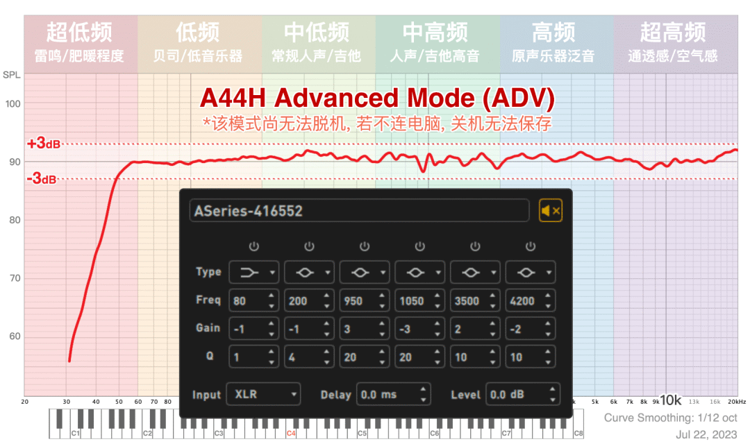 这时实测的曲线能吊打所有 4”监听.. (除非其他音箱也有多段 EQ..) 这也不是没代价——由于用了两个 6dB (最大幅度) 来弥补 1kHz,所以总音量要衰减 12dB (避免增加底噪),另外目前 ADV 模式不能保存,脱离电脑 (拔网线) 后重新打开音箱,即使音箱小灯处于【Ext】模式,但声音测出来还是 Pure 模式,不知道日后的固件能不能解决。
