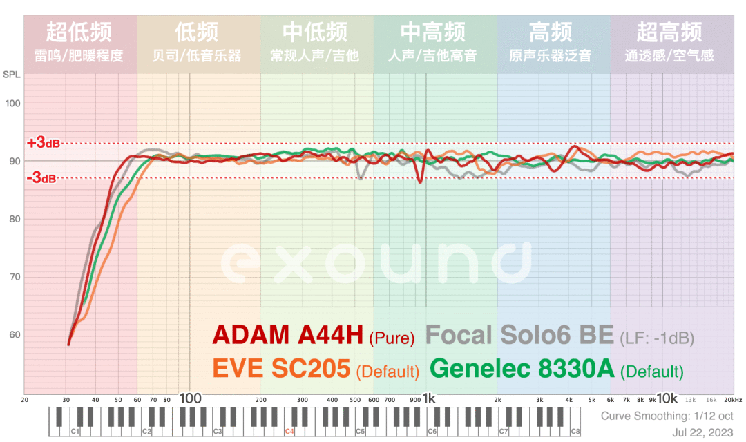 面对 Focal Solo6 它的下潜也不逊色,可能是它的低音功率 ( 2 x 90W ) 比 Solo6 的 150W 更大,但潜到 48Hz 后 A44H 衰减很陡峭,而大单元衰减更平缓,实际听感 Solo6 的下潜还是比 A44H 略深。