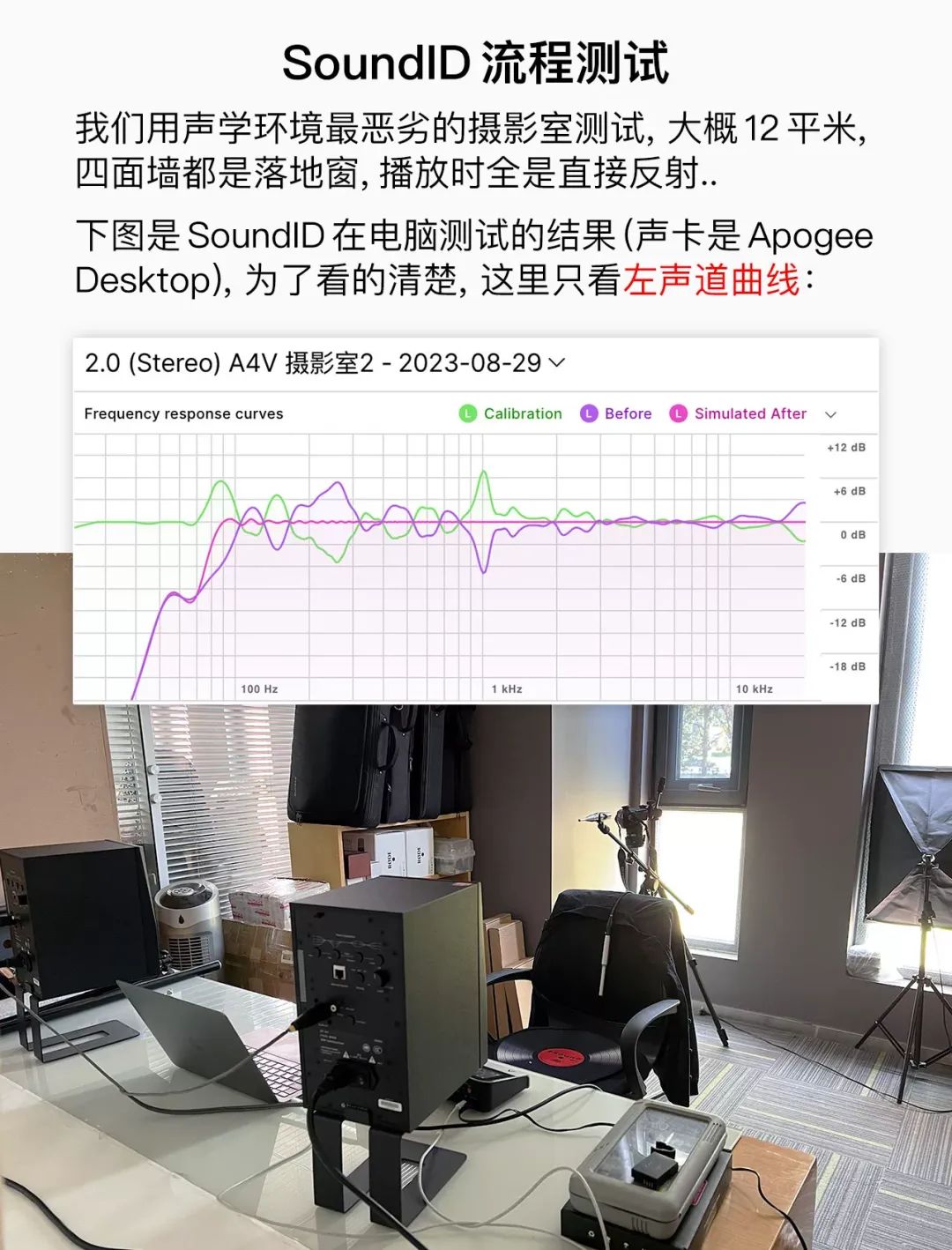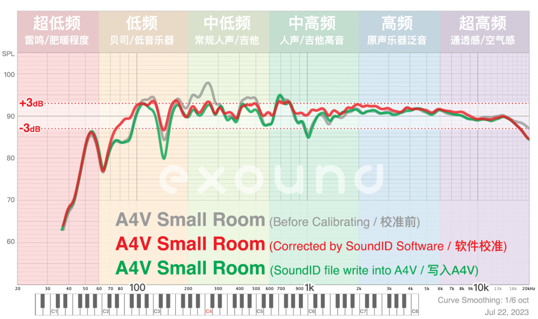 我们的实测 (下图灰线) 和 SoundID 很接近,SoundID 的多点校准会更精确,我们是单点快速测试,只是想看看 SoundID 的 DSP 版本是否和“CPU 版本”一致。 在电脑上用 SoundID 校准之后 果然准了很多 (下图绿线) 我们摄影室原本有 ±7dB (75 ~ 20kHz) 的误差,校准后接近 ±3dB,1kHz 的坑也补上了,150Hz 的坑应该是玻璃后墙的反射抵消,这是无法校准的 (校准软件不是万能)。 但 SoundID 写入 A4V 后 声音和电脑校准有点区别 最严重的 200 ~ 300Hz 大波峰和 400 ~ 500Hz 小波峰都处理掉了,但 1kHz 的“导管共振”没有处理 (软件版 SoundID 是处理了的),70 ~ 100Hz 的波谷也没有处理,另外在处理 100 ~ 140Hz 波峰时,影响到了 150Hz 的坑。 我们跟 ADAM 那边沟通了 这个功能还在完善中... 尽管目前不完美,但也确实有所改善。而且要再次强调——我们的测试房间是 12 平米的四面玻璃房,堪称声学灾难,如果是正常的房间,目前的固件已经能够胜任。 关键是:校准能“脱机”上文我们说过 Advanced 模式无法脱机,但 SoundID 写入 A4V 之后,拔掉网线重新开关音箱,音色不会恢复到 Pure,是可以脱离电脑的。