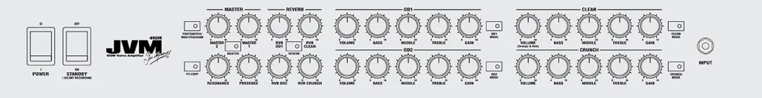 JVM410H可以有十二种不同的声音,它拥有四个通道,每个通道具有三种增益模式,这意味着 JVM 同样擅长演奏干净、金属或介于两者之间的任何东西。对于经典的清音通道,前置增益模拟老式放大器。或者在 Crunch 通道的顶端获得 Marshall 硬摇滚的声音。如果你想要更重,OD1 是完美的,而在 OD2 中,每个模式都是高增益,让你的铅金属色调闪耀。在每个通道中添加三路均衡器以及存在和共振控制,您可以熟练地塑造功率放大器的音色。