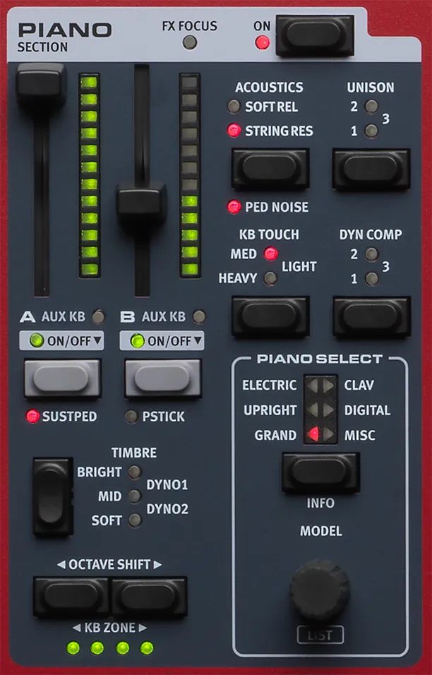 ● 创意音色预设Nord Stage 4 配备了来自我们独家的 Nord 钢琴库的三角钢琴、立式钢琴和电钢琴的全新增强系列,并结合了动态压缩和齐奏等新功能。