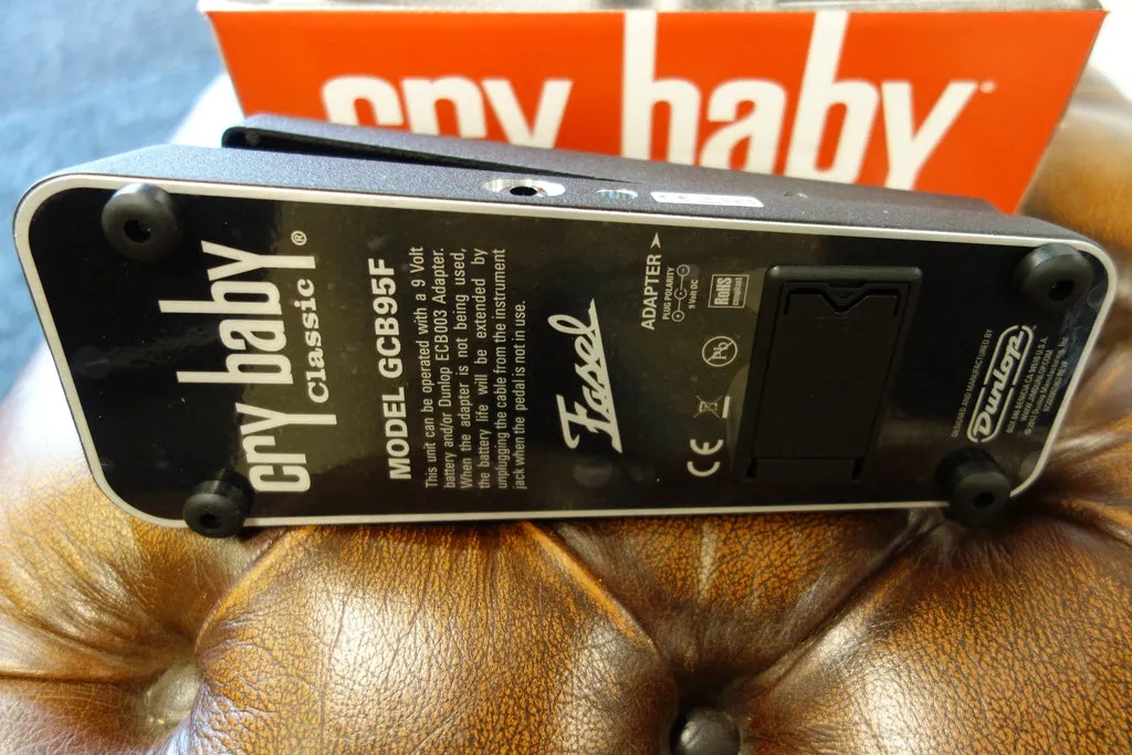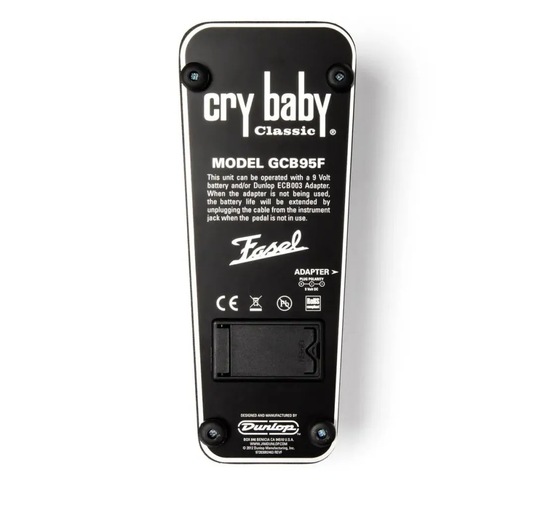 Dunlop GCB95F CRY BABY 经典哇音踏板效果器可由 9 伏电池、Dunlop ECB003 9 伏适配器或 DC Brick™、Iso-Brick™ 和 Mini Iso-Brick™ 电源(不包含在供货范围内)供电。
