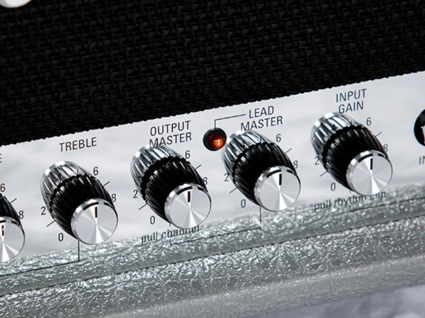 2555X 箱头的“低频”“ 中频”,“高频”和“临场度”控制旋钮,虽然所有的通道都通过这四个旋钮来控制3频,但是经由重新设计过的他们将比之前任何的Marshall产品能提供更多的音色变化。