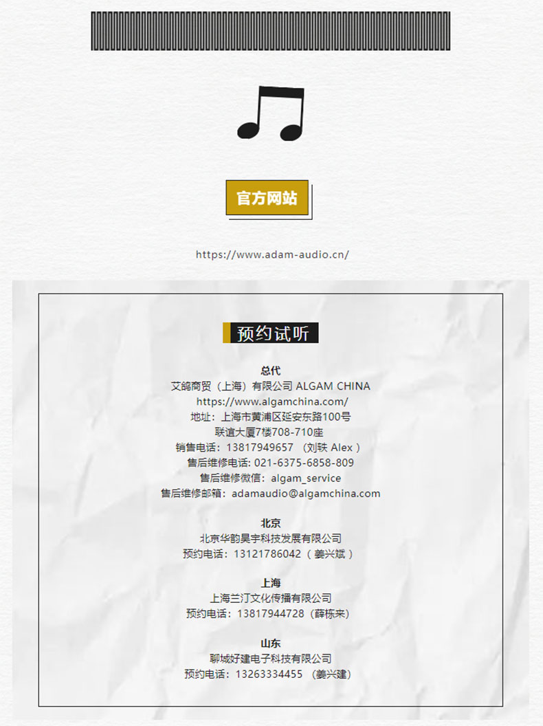 新品 D3V 已在上周举行的的 MUSIC CHINA 中国(上海)国际乐器展览会上提供试听,并收到了不错的反响,期待与更多用户见面! 全新 ADAM Audio D3V 已于各大渠道开启售卖。