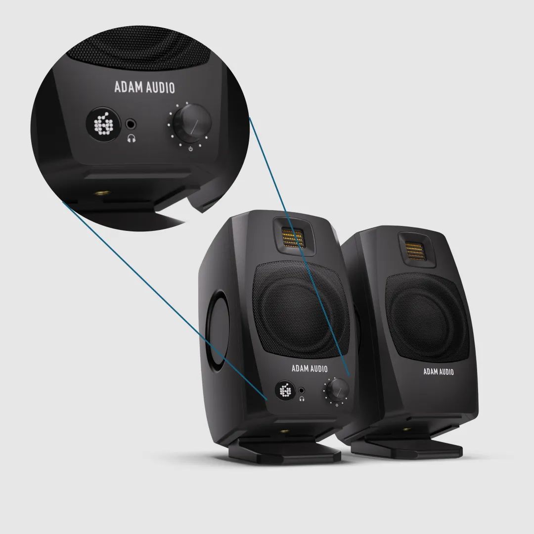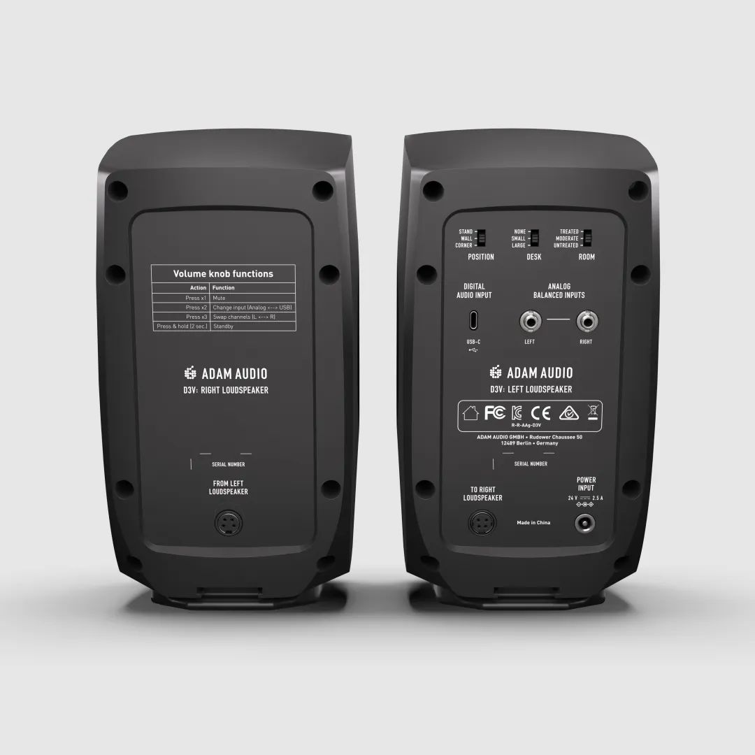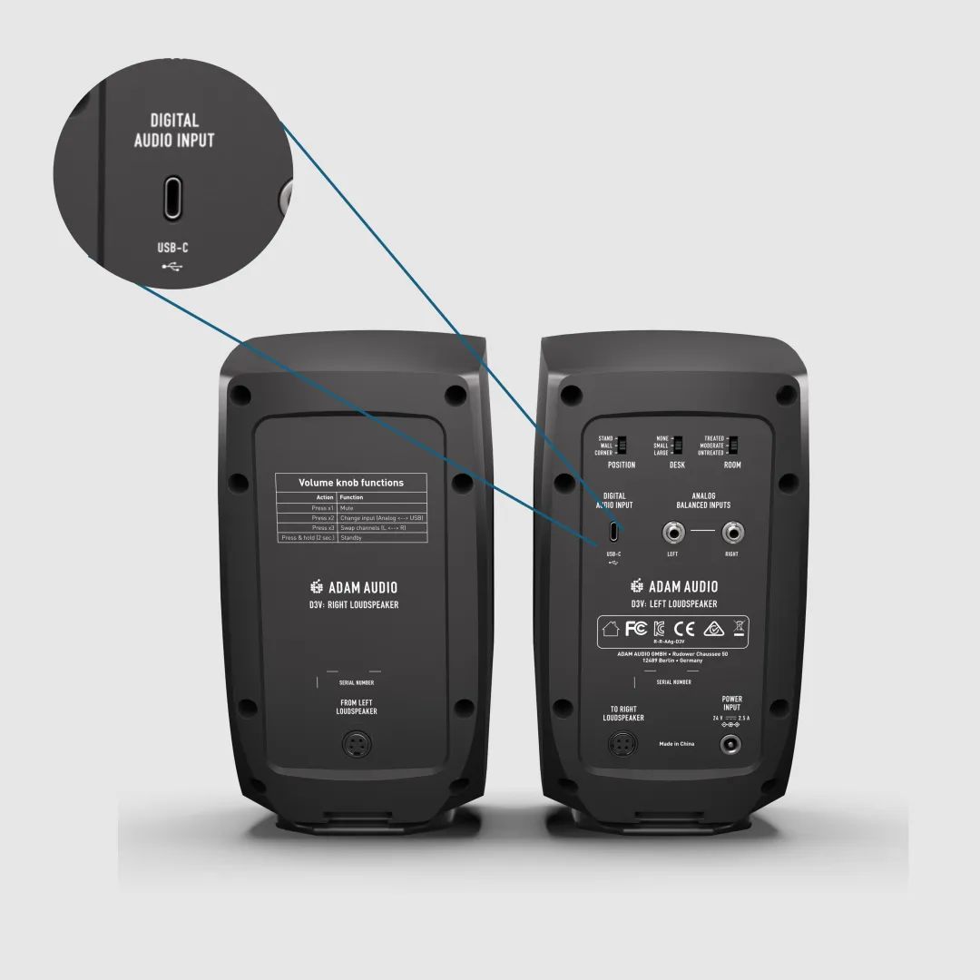 和双面无源散热器 」 和 D-ART 系统合作,D3V 利用有源 3.5"低音和铁氧体磁铁单元来处理低频率。受 80 W、低失真的双放大器驱动,铝质超低音音箱能帮助 D3V 达到最高 96 dB 的 SPL。无源散热器能将低音向下延展至 45 Hz,D3V 的超低音音箱因此能和其配合使用。 3.5"铝制低音单元 这些驱动器是专门为 D3V 开发的,也以轻量和极强度为设计精髓。强化的音圈结合处,独特的锥形面以及线性和长衡设计,都使得驱动器能够在避免任何分裂或音频扭曲的同时提高空气容量。 双面无源散热器在无源 3.5"低音双散热器的帮助下,D3V 有更好的重击和低端表现,在 ADAM Audio 史无前例。这种技术透过来自有源驱动器的空气压力变化,震动出一个带有不同加权、几何学和减震特性的独特光圈。此设备是专门为低频率信号再现设计的。 特殊罗纹的驱动器缘饰能带来稳定的移动,因为不具备有源音圈,因此散热器光圈能被打造得极为坚硬和灵敏,这都能帮助减少失真,并以紧密平衡的表现传递延展的低音响应,对于混音和正确的音频回放而言至关重要。 四个独立的通道 D3V 使用创新的单一芯片和四通道放大器技术,让一切更为精简。这种两段系统将主要/活跃设备中的所有电子设备聚集在一起,驱动系统中的所有四个有源驱动器。这个解决方案的设置十分简单,凸显了 D3V 容易携带的优点。 主设备可以从左切换到右侧的通道输出,让用户可以根据偏好量身定制设置。 「直接数字连接」 D3V 提供 USB-C 的直接连接,能连到电脑、手机和平板,即插即用。传统的 ¼"TRS 输入也包含在内,能用来连接乐器、接口和其他录音室设备。