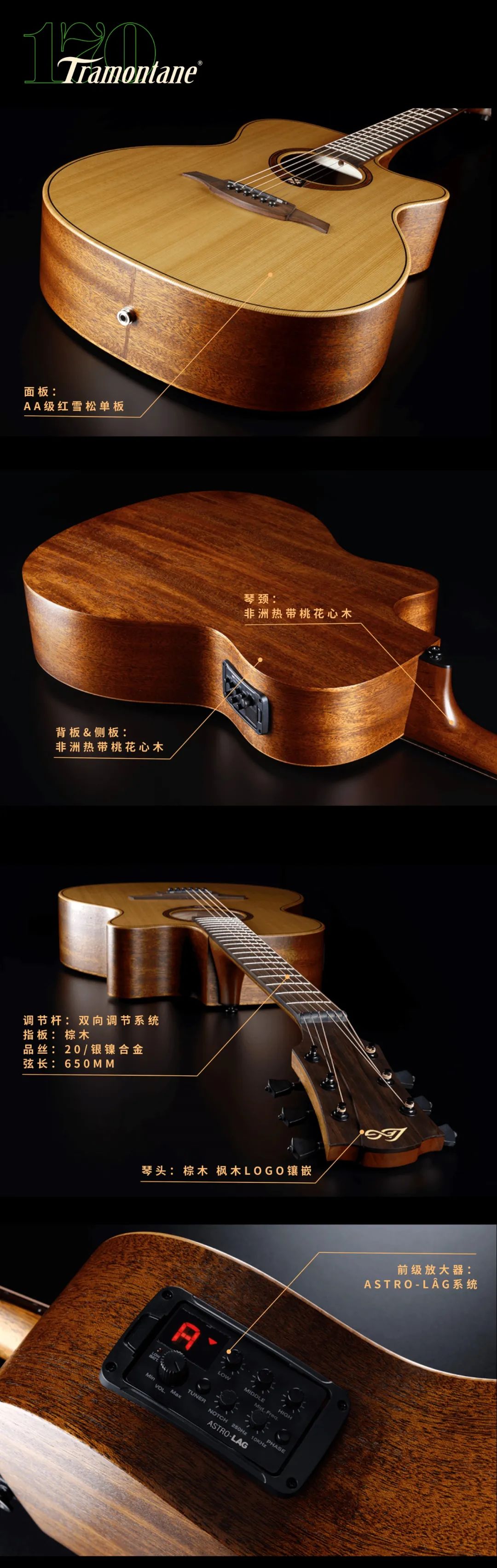 来自法国工艺的独特美学 TRAMONTANE系列 T170是整个系列中第一款带有AA级红雪松单板的吉他,这也是针对它的声学品质而所做的精心选择。 T170提供有DREADNOUGHT和AUDITORIUM两种形状的琴体,能提供深厚温暖的音色,电箱版的ASTRO-LAG前置放大器则忠实地再现了这种杰出的音色。