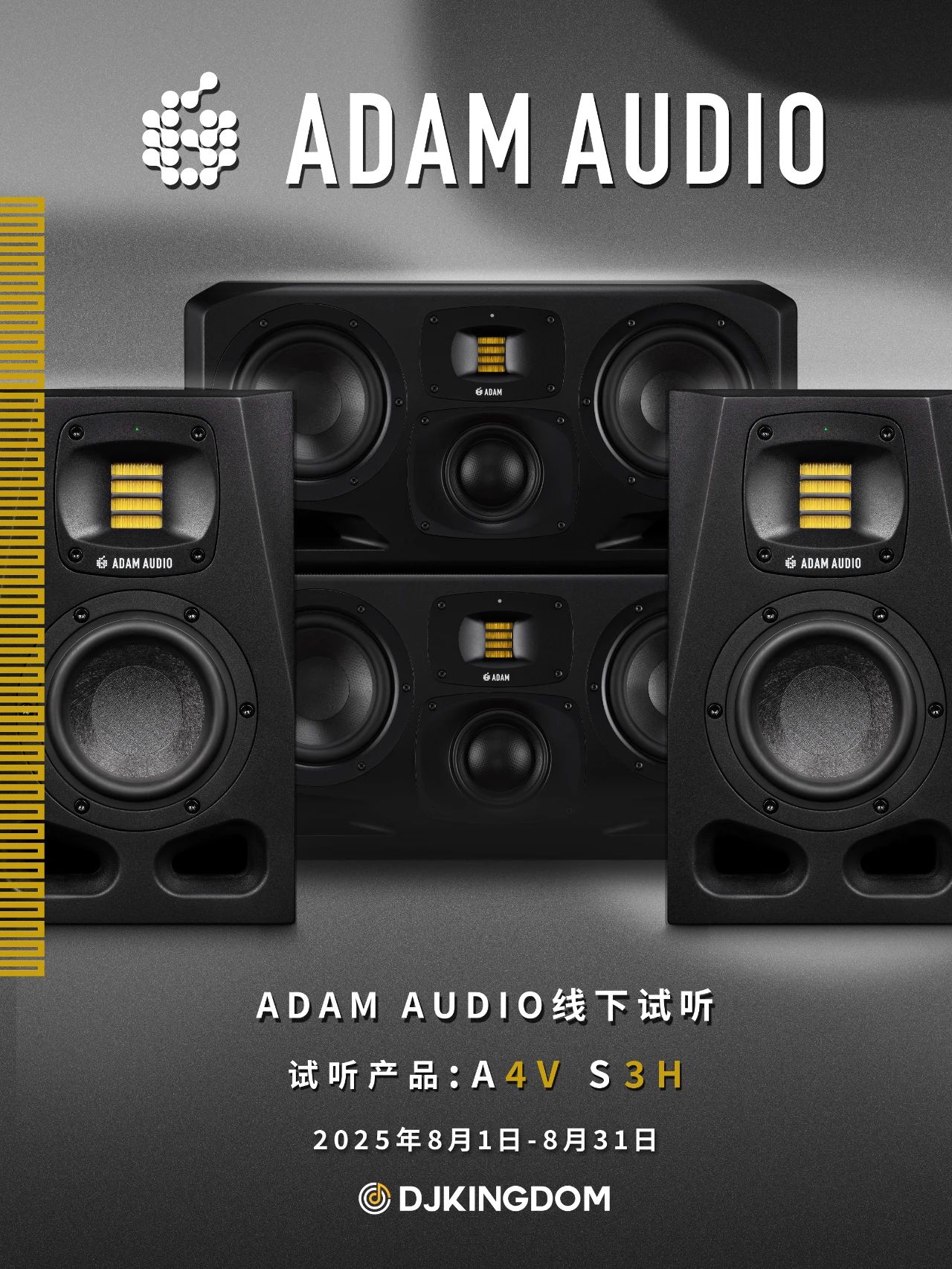 ADAM AUDIO 携 A4V 和 S3H 诚意而至,诚邀专业音频从业者与发烧友,开启沉浸式监听体验之旅。 试听主角