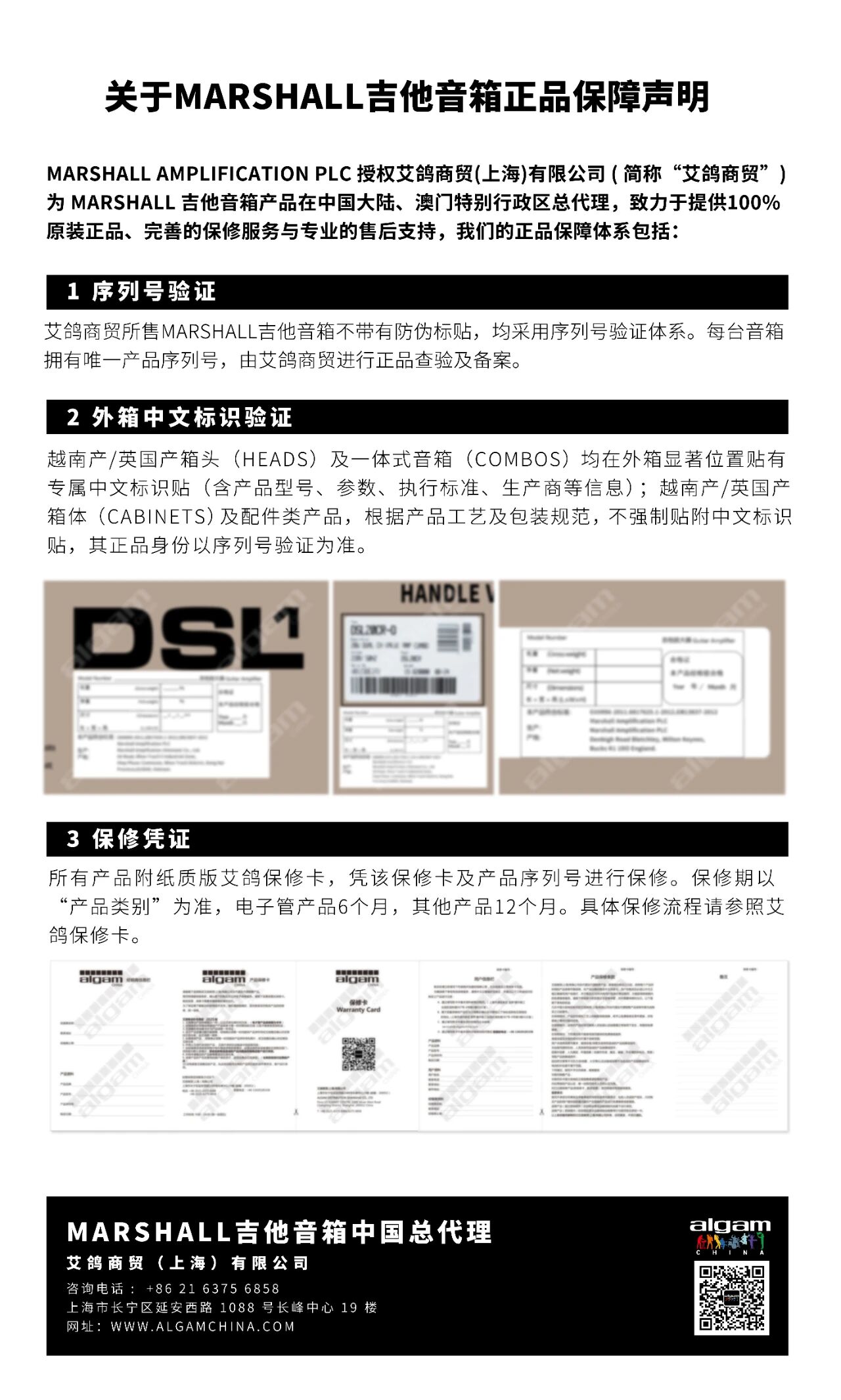 第一步:认准代理 官方总代理是 艾鸽商贸(上海)有限公司。确保你的购买渠道源自于此或其授权经销商。 第二步:核对序列号 艾鸽商贸所售MARSHALL吉他音箱不带有防伪标贴,均采用序列号验证体系 每台音箱拥有唯一产品序列号,由艾鸽商贸进行正品查验及备案。 第三步:检查凭证 看外箱:越南/英国产的箱头和一体箱,外箱有中文标识贴。箱体和配件不一定有,别纠结,以序列号为准。(具体保修流程请参照艾鸽保修卡)