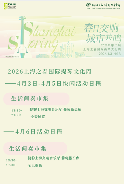 春风正好,弦音悠扬,这场藏在城市里的生活间奏,藏着音乐的浪漫、手作的温度与生活的治愈。4月3日-6日,捷豹上海交响音乐厅葡萄藤长廊,邀你前来,在春日市集中发现音乐DNA,邂逅生活的万般美好! 假期错过市集,文化周期间仍可打卡
