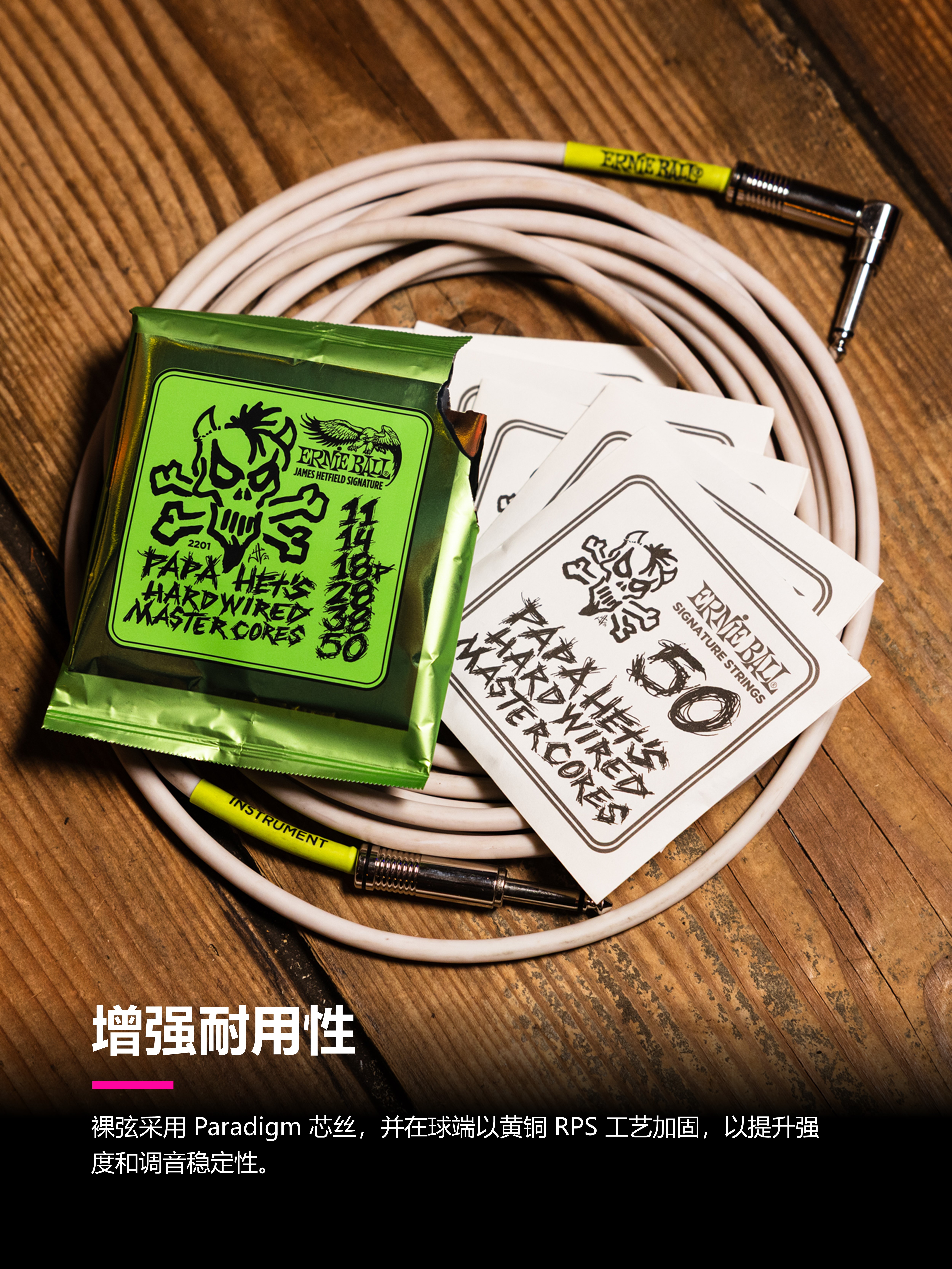 为了支撑这种演奏强度,James 与 Ernie Ball 联手打造了一套真正属于重型节奏吉他手的武器—— Papa Het’s Hardwired Master Cores Signature Strings