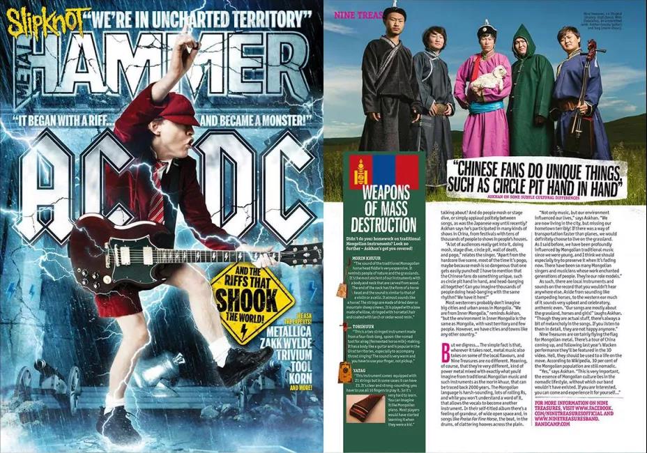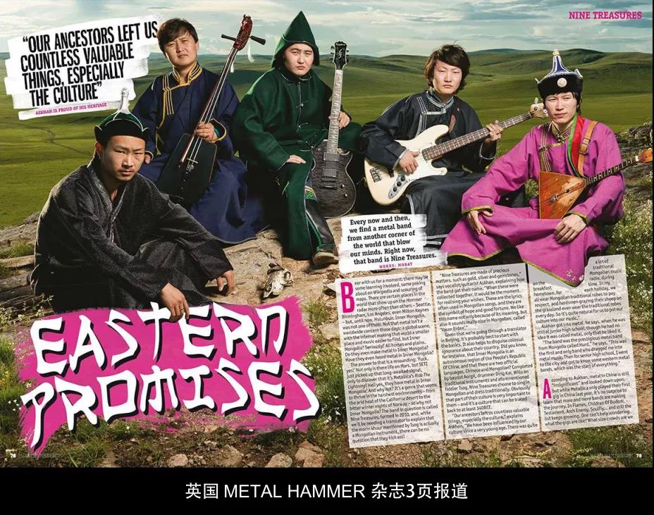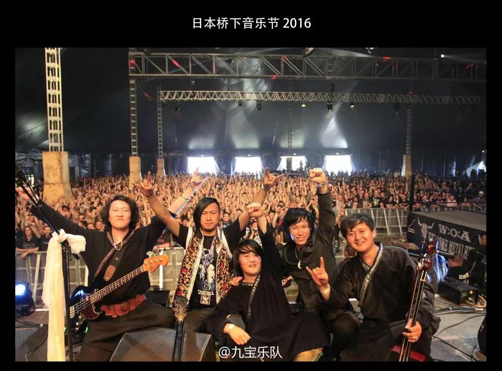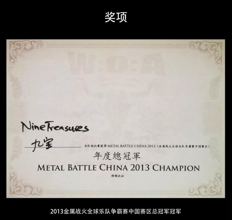 九宝乐队于2011年在中国北京组建,是当时唯一一支以蒙古语演唱的民谣金属乐队。组建初期乐手成员还不固定,贝斯手敖瑞峰的加入让乐队有了信心,同 时敖瑞峰又将鼓手丁凯介绍给乐队;而弹拨乐手塞纳在大学时期与主唱阿斯汗 组过M-Survivor乐队,后去日本留学,留学归来立刻加入到九宝的音乐中。组建初期乐队在一些小型Club进行演出,直到2012年乐队发行了首张专辑《十丈铜嘴》(ArvanAldGuulinHonshoor)才被乐迷所熟知,他们音乐中传递的 草原神话哲学令他们有了众多拥趸,并在音乐上有十分鲜明的辨识度。 2013年,乐队赢得了WACKENMETALBATTLE中国区冠军,并奔赴德国参加 了WACKENOPENAIR的演出,并在演出结束后成为了当时演出乐队中最受 瞩目的年轻乐队,同时也被邀请拍摄关于WACKEN的3D纪录片,完整记录了 九宝乐队参与该音乐节以来发生的种种事情及演出情况。这次演出奠定了九宝乐队在国内金属乐的一席之地,不仅让更多人关注到了这支由蒙古人组建的乐队,同时他们也身体力行的用民谣金属向外界传递蒙古草原文化中最神秘莫测的那部分。 同年年底,乐队发行了同名专辑《NineTreasures》并进行了首次在中国北方区域的巡演。2014年春天,乐队进行了首次南方巡演并参加了国内的一些音乐节,这让这支 年轻的乐队拥有了更多的自信,并开始试图在音乐上有新的拓展,保持旺盛的音乐创造力。 2015年初乐队发行了EP《GallopingWhiteHorse》并进行了包括30多个城市的首次真正意义上的全国巡演。乐队历经几年的演出经验,自然就把目光转移到国外,同年乐队进行了首次欧洲巡演,包括德国、捷克、波兰、荷兰、丹麦 、拉脱维亚、匈牙利等。九宝乐队的音乐中不仅有充满张力的蒙古元素,同时 在急速的节奏下保持一种秩序感,在编曲中非常重视器乐之间的细节处理,这 让他们的音乐有很强的邪典式的美感。 2016年乐队发行了全新专辑《灵眼》(WisdomEyes),并在蒙古国拍摄了同名MV,这张专辑与以往的音乐风格都有了明显的区别,他们将目光从草原的神秘哲学转向了蒙古人生活中更为真实的地方,在日日重复的蒙古文化的生活里,将时间带给蒙古文化的变化尽数唱来,九宝乐队开始直面蒙古生活残酷的那部分,歌词也有了残酷的诗意,使得这张专辑有了更为深刻的意义和价值; 同年进行了破纪录的43个城市的国内巡演,从北京开始,以家乡呼伦贝尔盟收尾历经半年时间;以及第二次欧洲巡演;同时在欧洲参加了Woodstock、 MetalDays等大型音乐节,同年年底在北京糖果Tango进行了空前的1000+观众的大型演出。 2017年乐队丝毫没有懈怠,继续保持惊人的演出频率和旺盛的创作力,6月份进行了第三次欧洲夏季巡演,并着手录制最新的概念EP。而在第三次欧洲巡演前夕,九宝乐队毫无悬念的获得了波兰伍德斯托克音乐节GoldenSpiningTop Award奖项冠军,成为第一支获得此殊荣的中国乐队并登上了伍德斯托克音乐节主舞台。