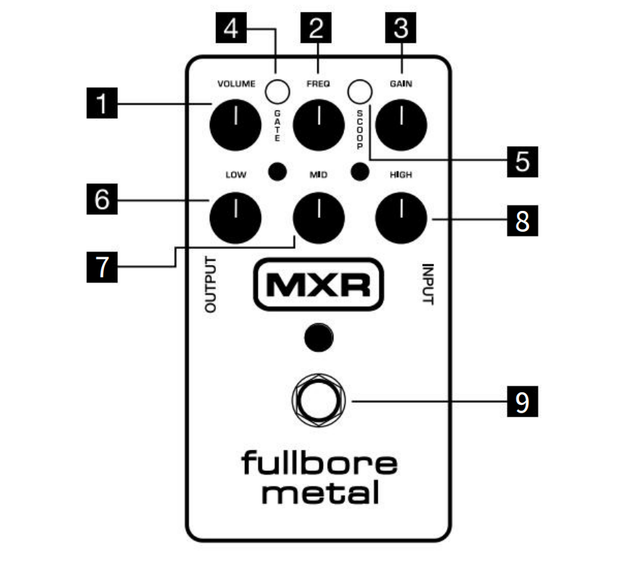 Fullbore Metal Distortion 提供高增益失真、3 段均衡器、中频扫描控制、Scoop 开关和带内部灵敏度控制的可切换噪声门。