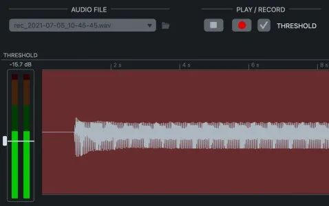 现在按下 Record就可以开始录音了。一旦输入电平超过阈值电平,录音就开始了。在触发之前始终保存 1.5 秒的前贴片音频。再次按下录制按钮也可以手动开始录制。
