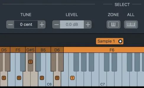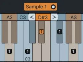 完全按照音频文件中的声音播放样本的键称为根键,并用填充的矩形标记。矩形中的数字表示分配给该主键的样本数。键盘上的样本所覆盖的范围构成了一个区域。