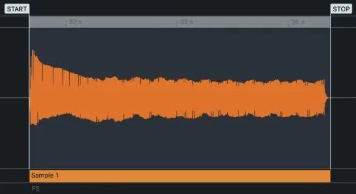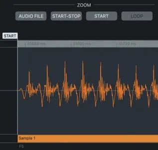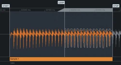 当样本设置为“循环”时,它会在到达停止标记时跳回循环位置并以这种方式无限期地播放。循环范围是通过将循环和停止标记拖到所需位置来定义的。“循环”缩放按钮放大循环的音频区域,允许更精确的标记放置。