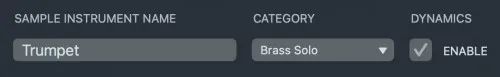 在“Sample Instrument Name”字段中给样品仪器一个合适的名称,然后从“Category”下拉菜单中选择一个适当的类别。如果启用“动态”,则振幅、滤波器速度响应和包络形状的适当设置将根据所选类别应用于样本乐器。