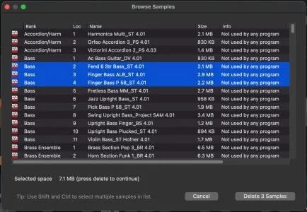 如果 Nord 中没有足够的可用内存,“管理器”窗口允许从 Nord 样本内存中查找和删除样本乐器。可以删除“未被任何程序使用”的样本,而不会影响 Nord 程序库中的程序。