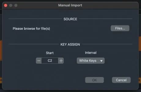 “导入”按钮的下拉菜单提供了手动导入选项。在其对话窗口中,选择一个或多个音频文件,然后选择第一个样本的开始键以及应将样本分配给键的间隔。