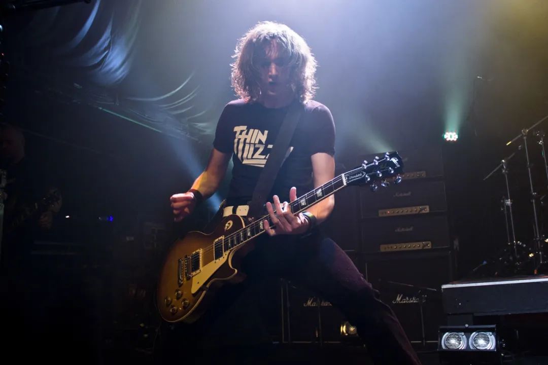 The Darkness 的吉他手 Dan Hawkins 在加利福尼亚州阿纳海姆举行的 NAMM Show 上使用 Studio Vintage 音箱进行表演。