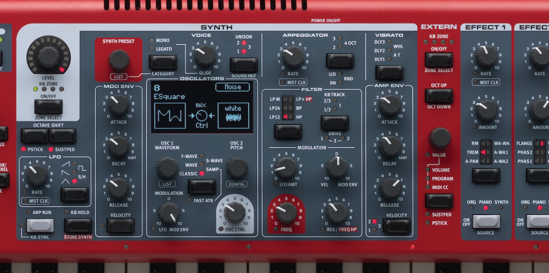 Lead A1合成引擎凭借自身模拟建模的温暖音色而出名,并且利用超凡的智能振荡器配置以极少的编程就能带来令人震惊的结果。既有单振荡器设置,其中包含了音调和形状模式,也有双振荡器设置,其中包含了离调、同步、波形、铃声与噪音混合模式、调频以及环形调制模式。合成部分还提供了3种同度模式,并且同度模式不会减少复音数。Nord Stage 3上新的振荡器部分拥有5种振荡器类别:经典、波形、共振峰、采样以及全新的超级波形(S-wave)。
