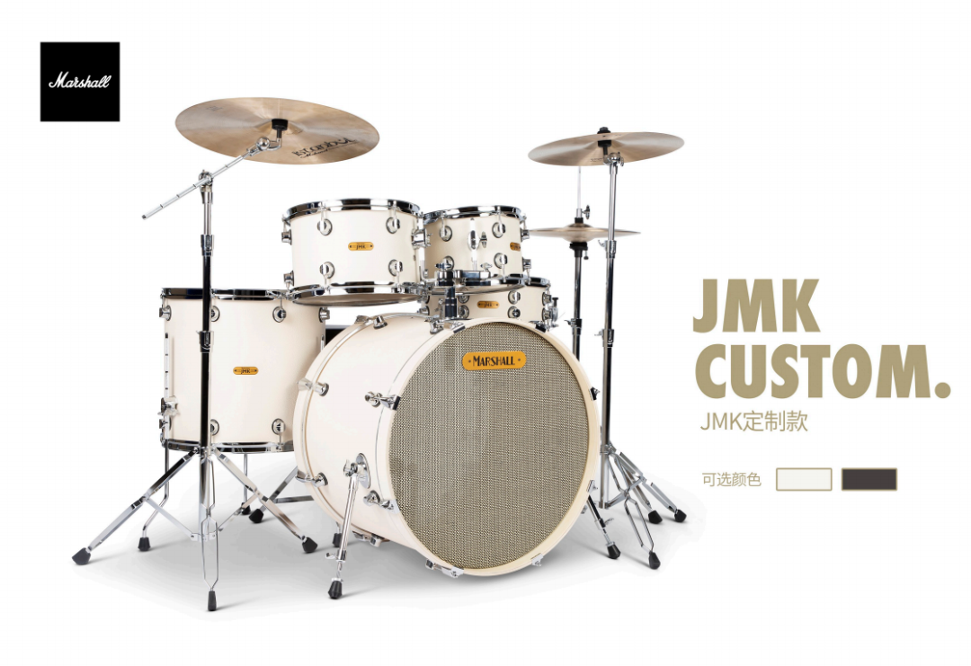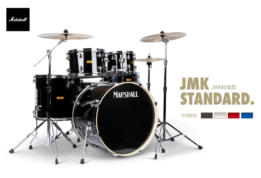 MARSHALL JMK标准系列套鼓,该系列共有四种颜色,有黑色、红色、蓝色以及银色。其包含了22英寸的底鼓,14英寸的军鼓以及10英寸、12英寸、16英寸的嗵鼓。 整套鼓采用6层叠加白杨木腔体,与PVC涂装工艺。鼓皮采用了TORAY HAZY 系列,厚度仅0.188mm,极具张力,提升了敲击的声音动态范围。其音色整体给人眼前一亮的感觉,并且声音具有爆发力且通透紧实。一些小细节例如嗵鼓的支架采用了万向轮的设计,这很方便鼓手快速调整自己合适的演奏角度。