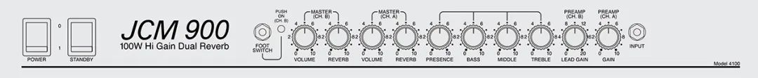 如今,JCM900仍以JCM900 4100的名义继续存在!再版的JCM900 4100是一款专为舞台设计的两通道双混响100W箱头,它增加了另一个通道、两个混响选项和两个增益功能。